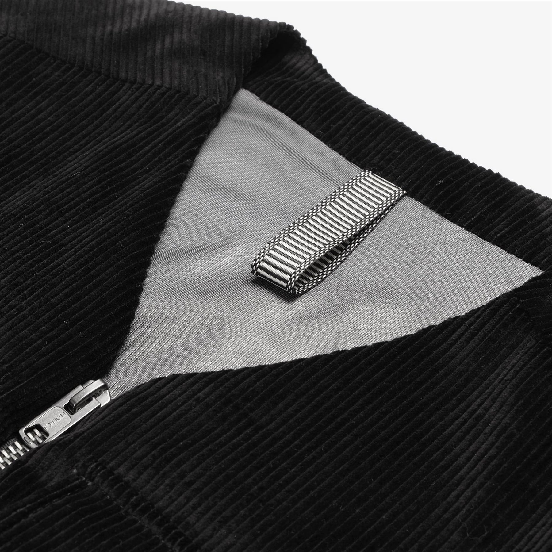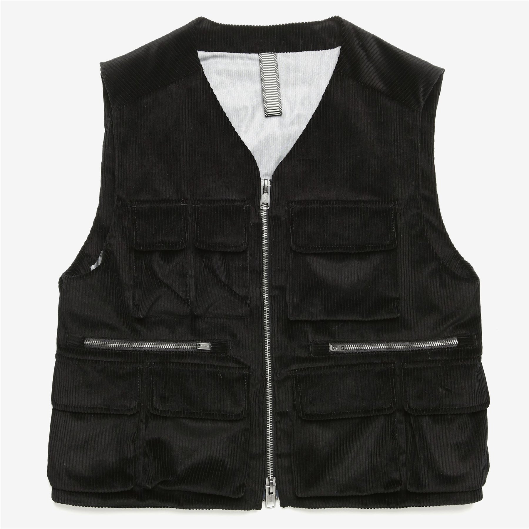 Vest made from Visconti di Modrone cotton corduroy. The vest features a functional design reminiscent of the classic hunting and fishing vest, with multi-purpose front patch pockets and a large back pocket. It is lined with windproof three-layer nylon and lightly padded. It has a metal front zip closure and an adjustable hem with snap buttons. The inner hanging loop is characterized by the iconic Matthoneddus graphic pattern, typical of the traditional Sardinian saddlebag (Sa Bèrtula). It is personalized internally with a QR label woven on a jacquard loom, providing more information about the project and the garment's identity.
