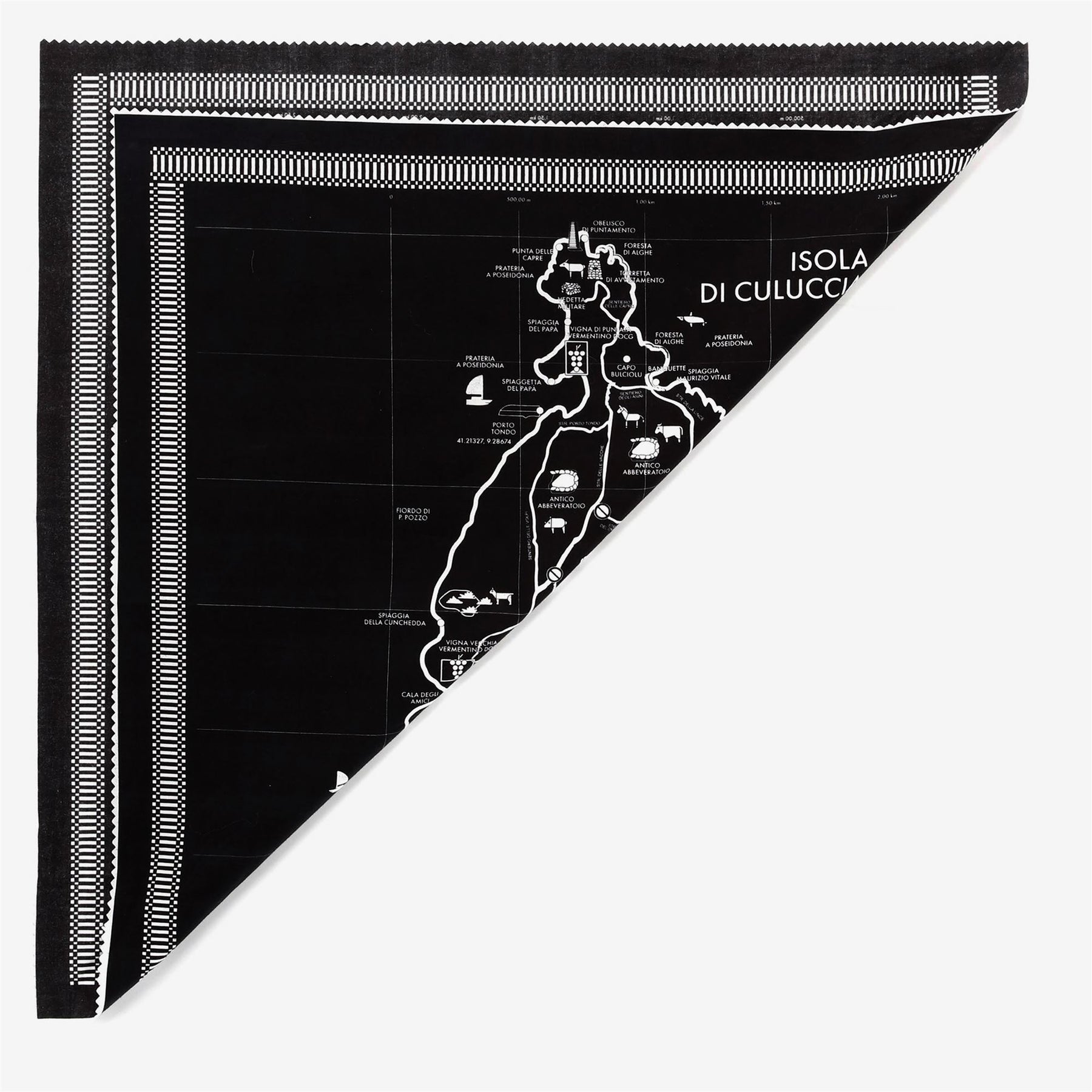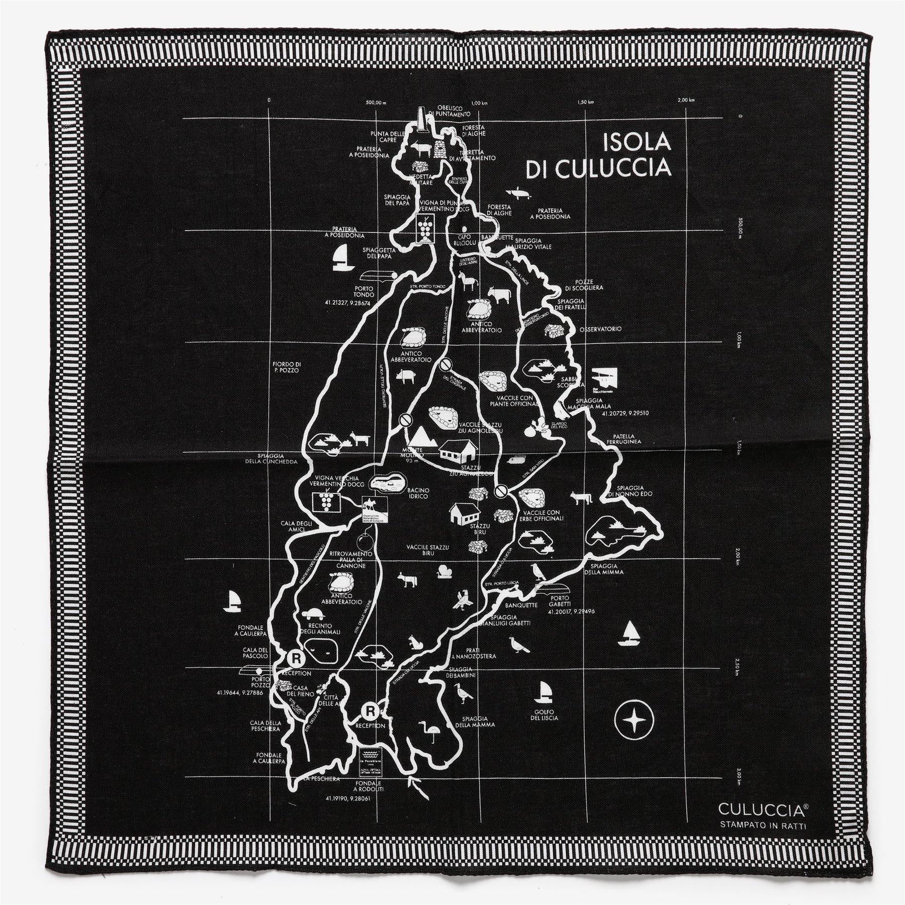 The neck scarf is designed to protect against sun and wind. This accessory is made from Panno Pranu, a cotton-linen fabric. The special feature is the silk-screen printing that reproduces the map of the island of Culuccia®. It measures 50cm x 50cm. Internally customized with a QR label crafted on a jacquard loom, allowing for deeper exploration of the project and the garment's identity.