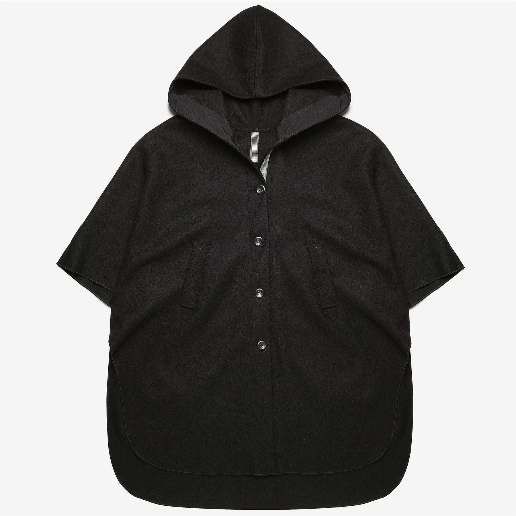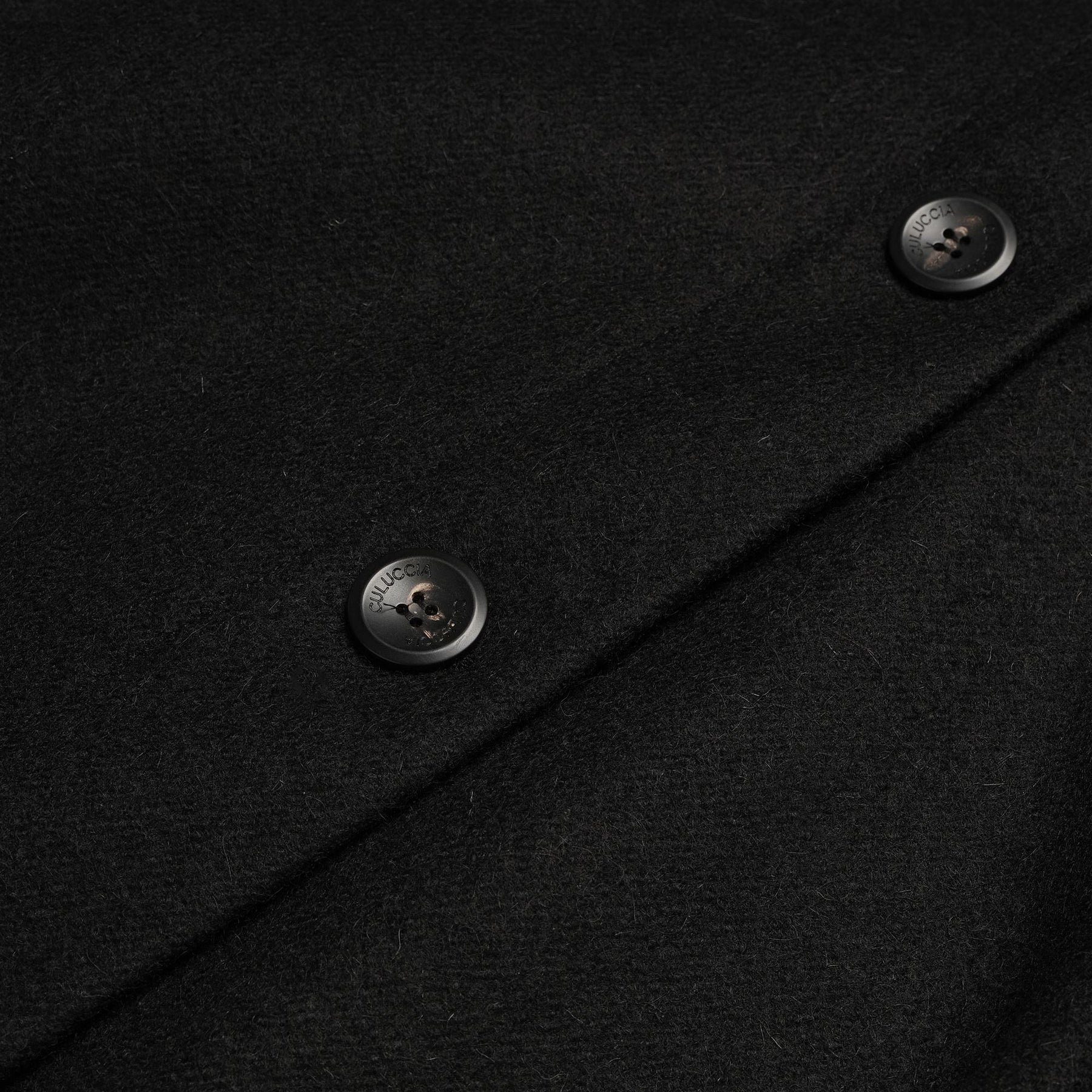 The Culuccia® cape is inspired by the traditional Sardinian cloak "Su saccu." This rough accessory garment, made by sewing together two large mirror-image pieces of orbace, served primarily practical purposes. It provided protection for the rider during travels, acted as a blanket during bivouacs, a tablecloth for shepherds' and travelers' countryside meals, or was folded to soften the rigid and angular Sardinian saddle. Culuccia®'s feminine version is made with four shaped panels sewn together in Sardinian wool cloth, resistant to wind and humidity, with natural water repellency. The fixed hood is lined internally with Cordura nylon, as is the front closure, which features the Matthoneddus tape with five large personalized horn buttons. The cape includes two large side pockets lined with brushed cotton handwarmer fabric, and two external buttons to close the flaps, forming wide sleeves. The inner hanger loop is characterized by the iconic Matthoneddus graphic motif, typical of the traditional Sardinian saddlebag (Sa Bèrtula). The garment is personalized internally with a QR label woven on a jacquard loom, offering deeper insight into the project and the identity of the piece.