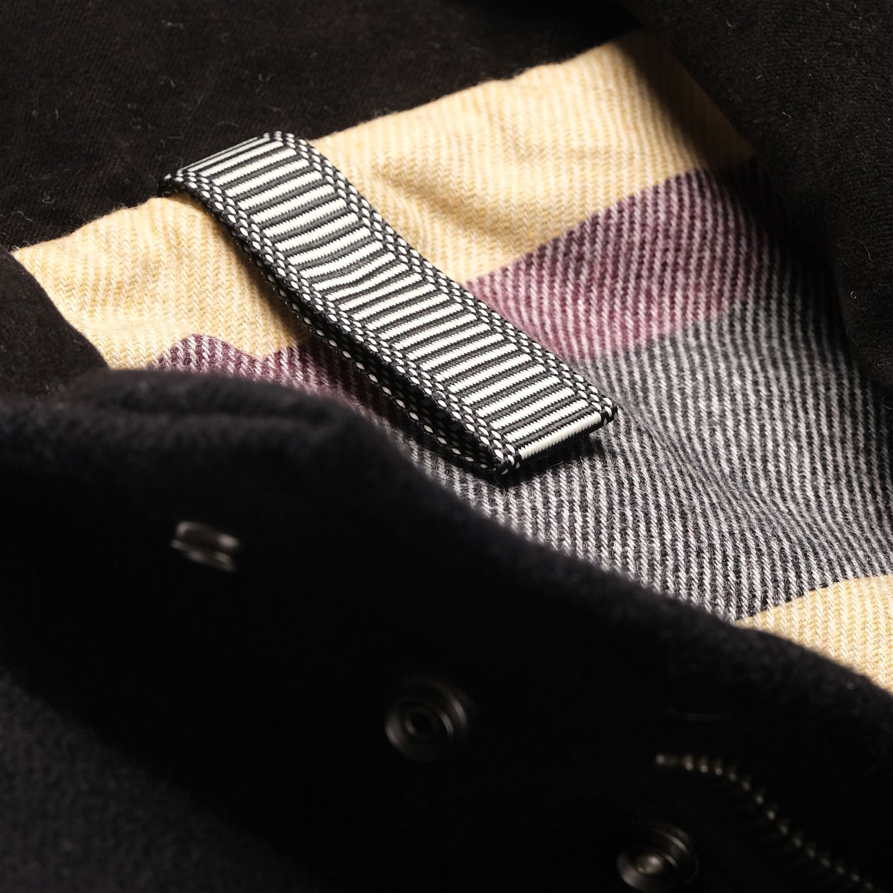 The Culuccia® coat is inspired by the classic duffle coat, worn by the Royal Navy during World War II. Made from heavy Sardinian wool cloth, it ensures excellent resistance to cold and humidity, along with natural water repellency. Lined with yarn-dyed striped wool flannel. The fixed hood is adjustable with a drawstring, and the front zip is covered by a flap to block wind. Two large exterior pockets with handwarmer openings and one internal chest pocket with a zip closure. Adjustable cuffs with double buttons. The inner hanger loop is characterized by the iconic Matthoneddus graphic motif, typical of the traditional Sardinian saddlebag (Sa Bèrtula). The interior is personalized with a QR label woven on a jacquard loom, allowing deeper insight into the project and the identity of the garment.