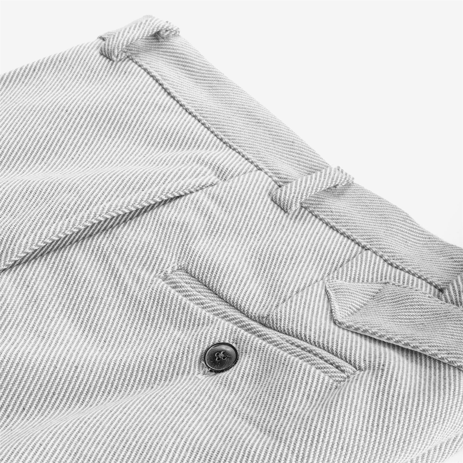 Chino pants are reinterpreted for outdoor activities. The model features a classic tailored-inspired line with a soft leg that slightly narrows at the bottom. It is finished with side welt pockets, a watch pocket, and buttoned back pockets. The garment is made from Peoprache, a pure cotton Batavia weave typical of island culture. The back strap allows for an adjustable fit, while the hem is reinforced with tape for increased wear resistance. Internally personalized with a QR label woven on jacquard, allowing for deeper insight into the garment's project and identity.